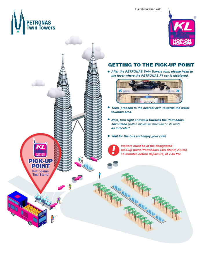 – For the ‘KL City of Lights’ tour, visitors must be at the designated pick-up point (Petrosains Taxi Stand, KLCC) 15 minutes before departure, at 7.45 PM.